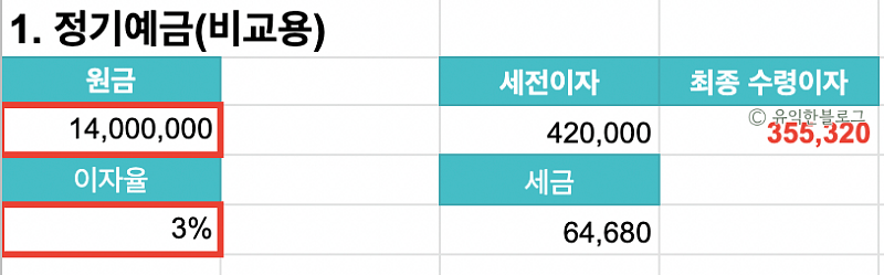 👉 세전이자 420,000원에서 세금 64,680원을 빼면 총 355,320원의 이자를 수령하게 됩니다.