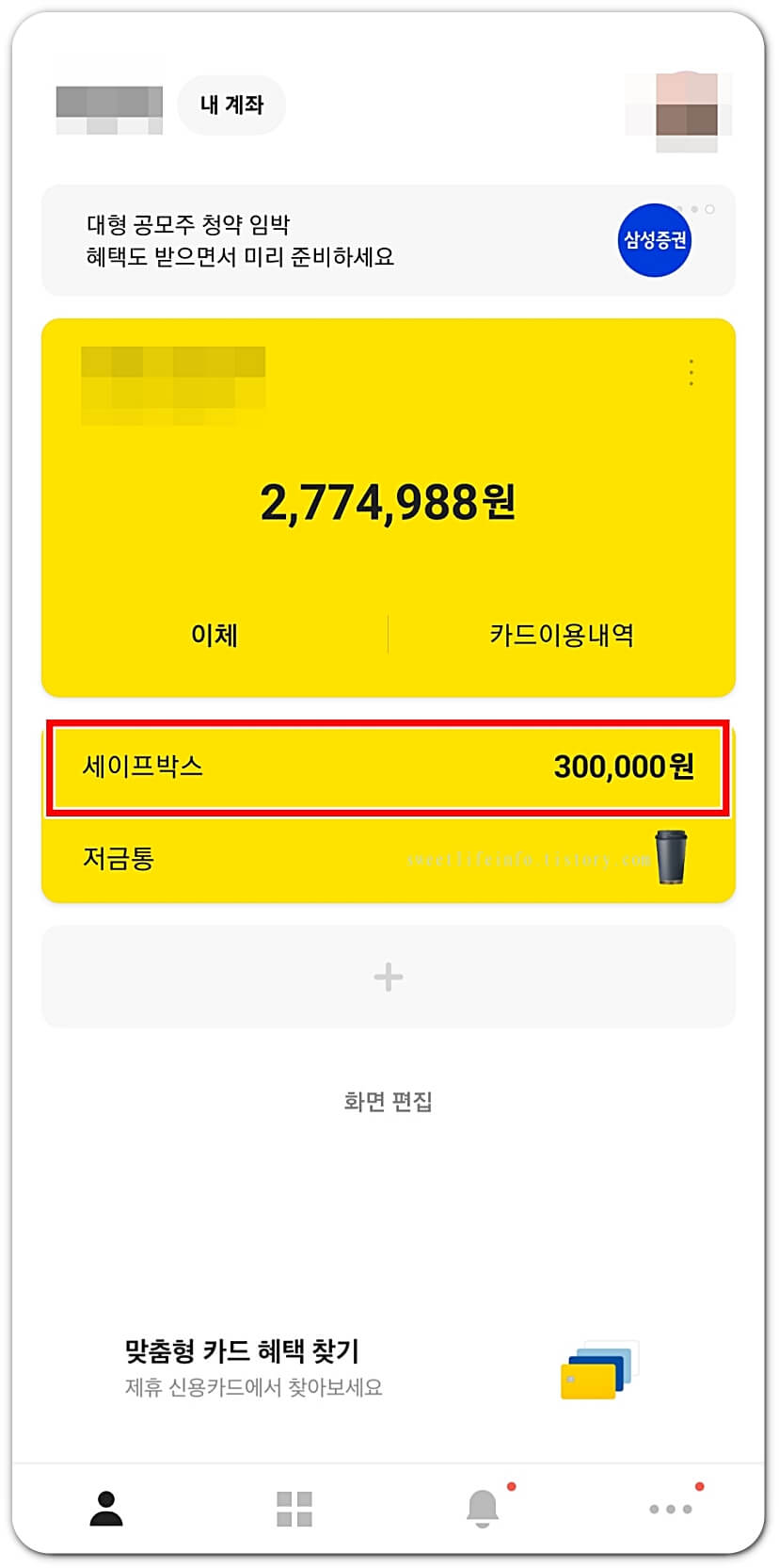 다시 메인 화면으로 돌아가면 내 계좌 아래에 ‘세이프박스'라는 문구와 함께 금액이 표시되어 있는 것을 확인할 수 있어요. 입출금 계좌 있던 금액이 빠져나가 세이프박스에 들어가 있다고 보면 됩니다.