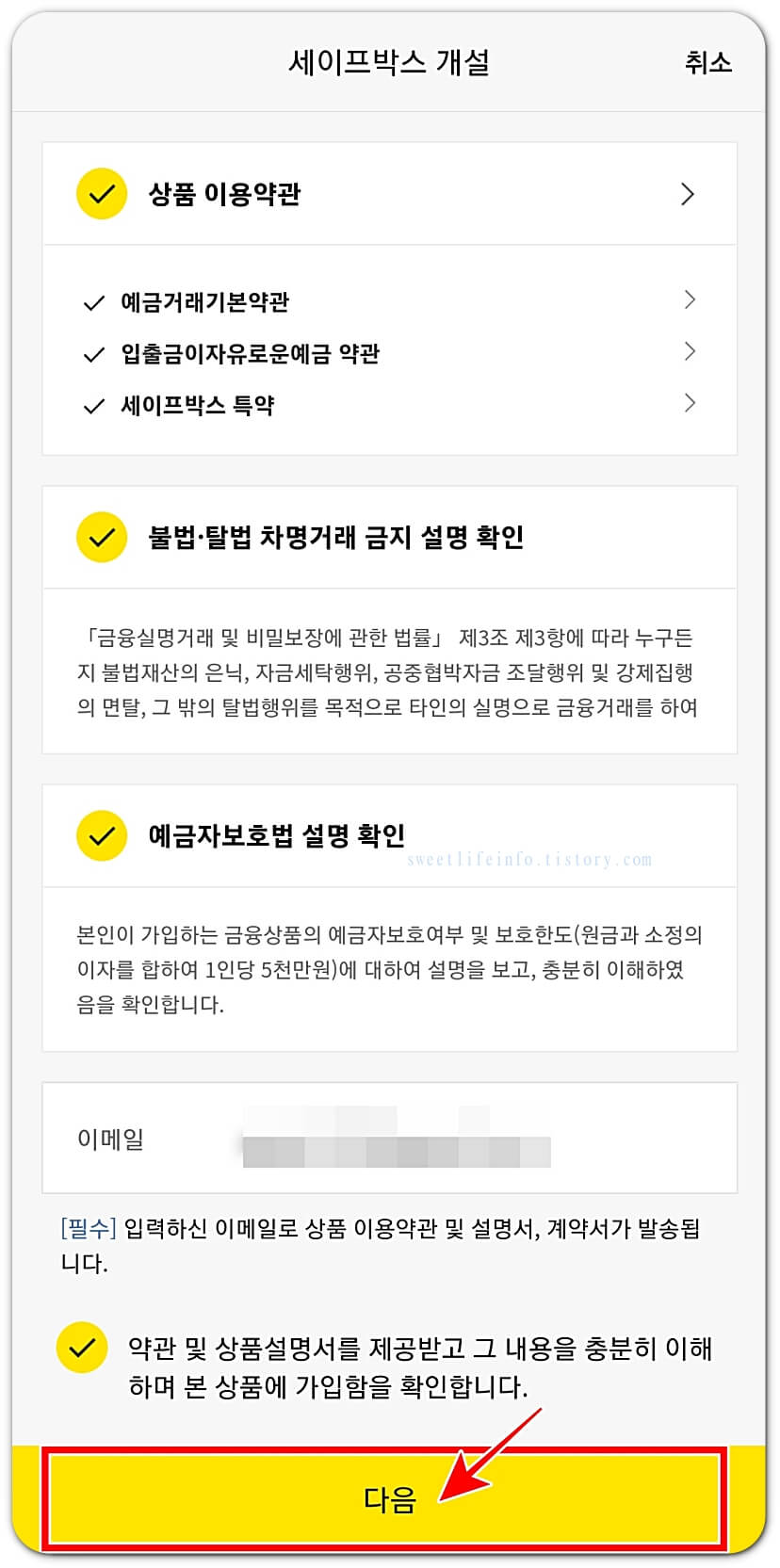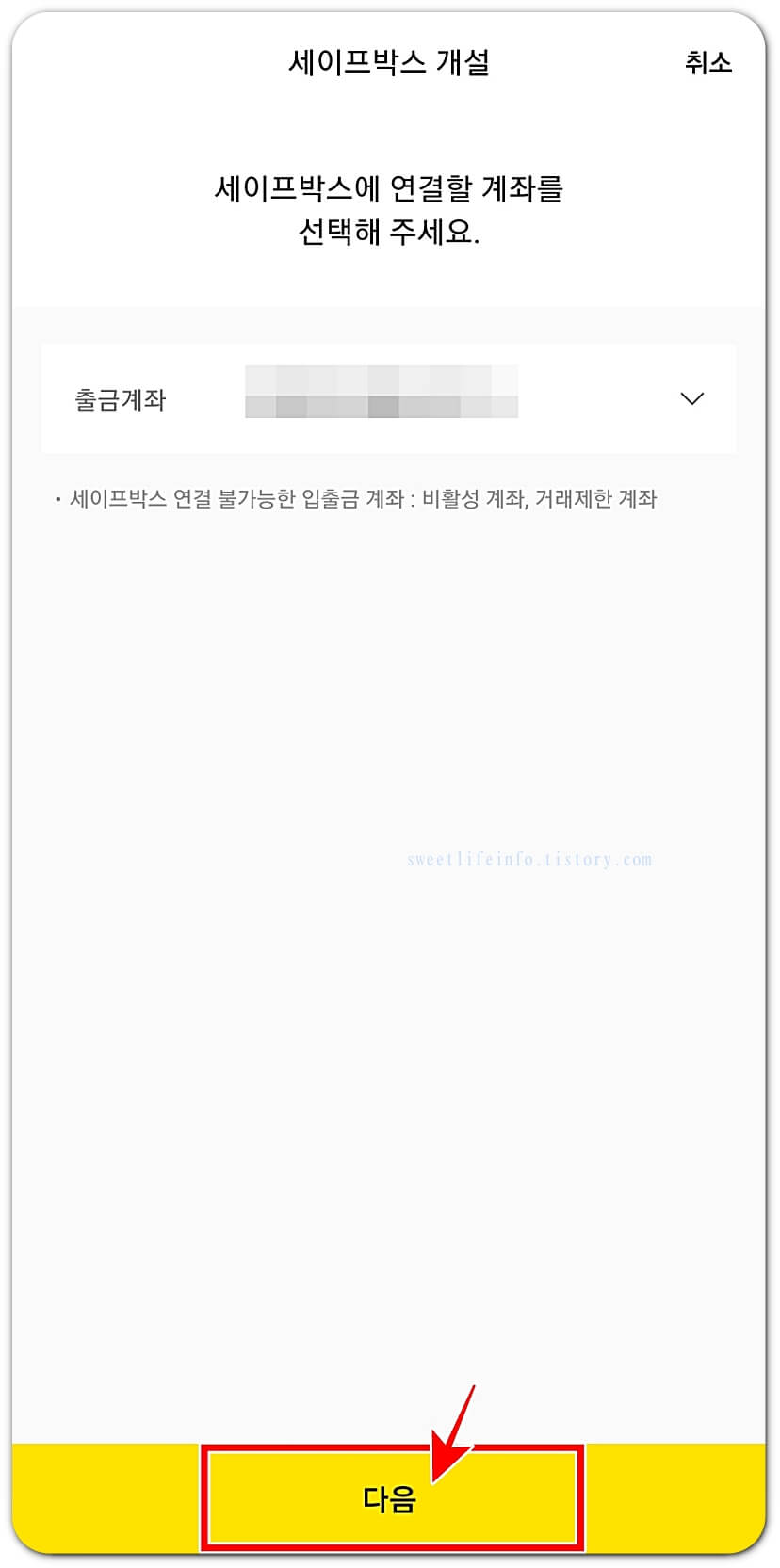 약관에 동의를 한 뒤 ‘다음' 버튼을 누르고, 세이프박스에 연결할 계좌를 선택한 뒤 ‘다음' 버튼을 누릅니다.