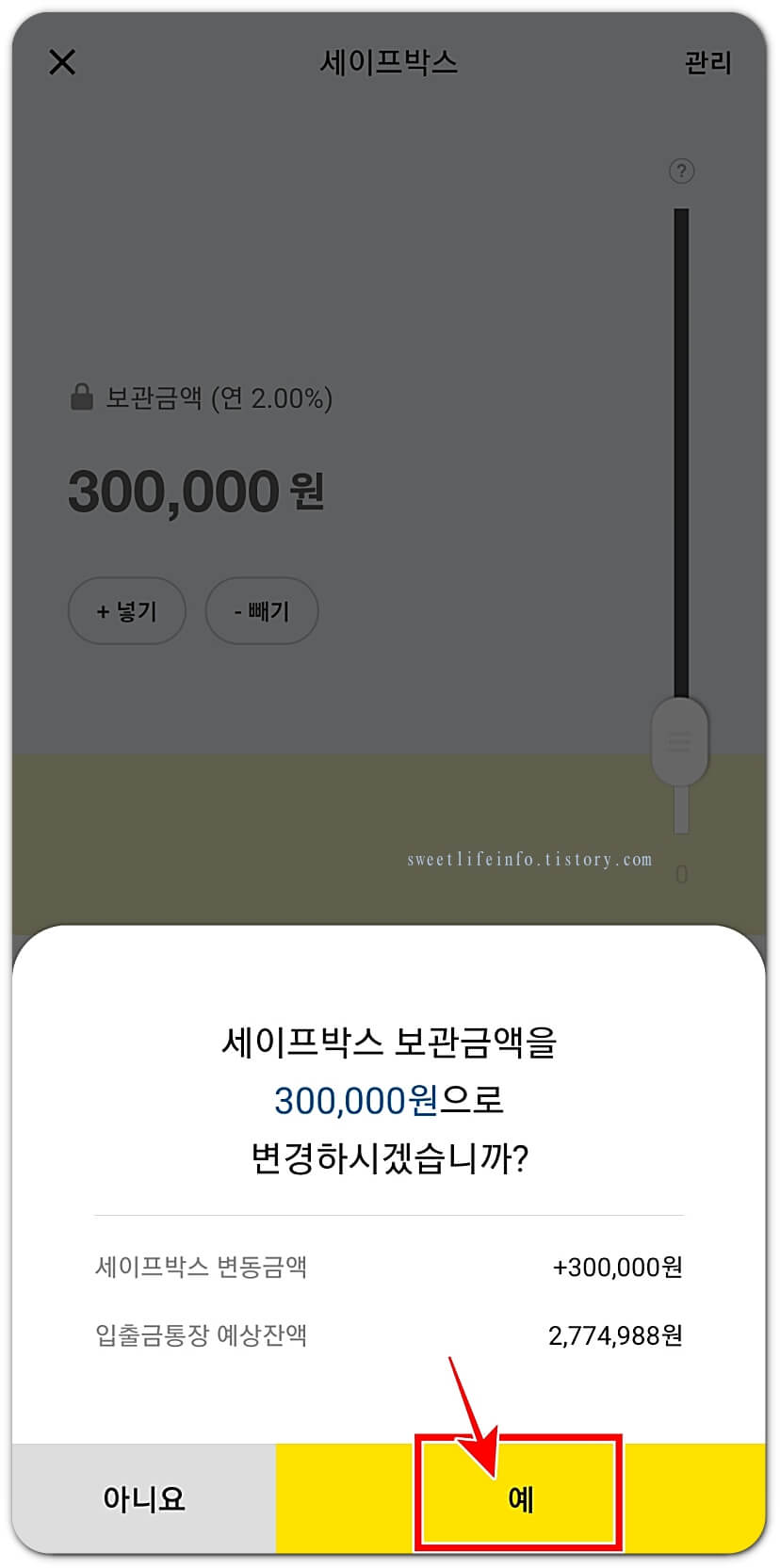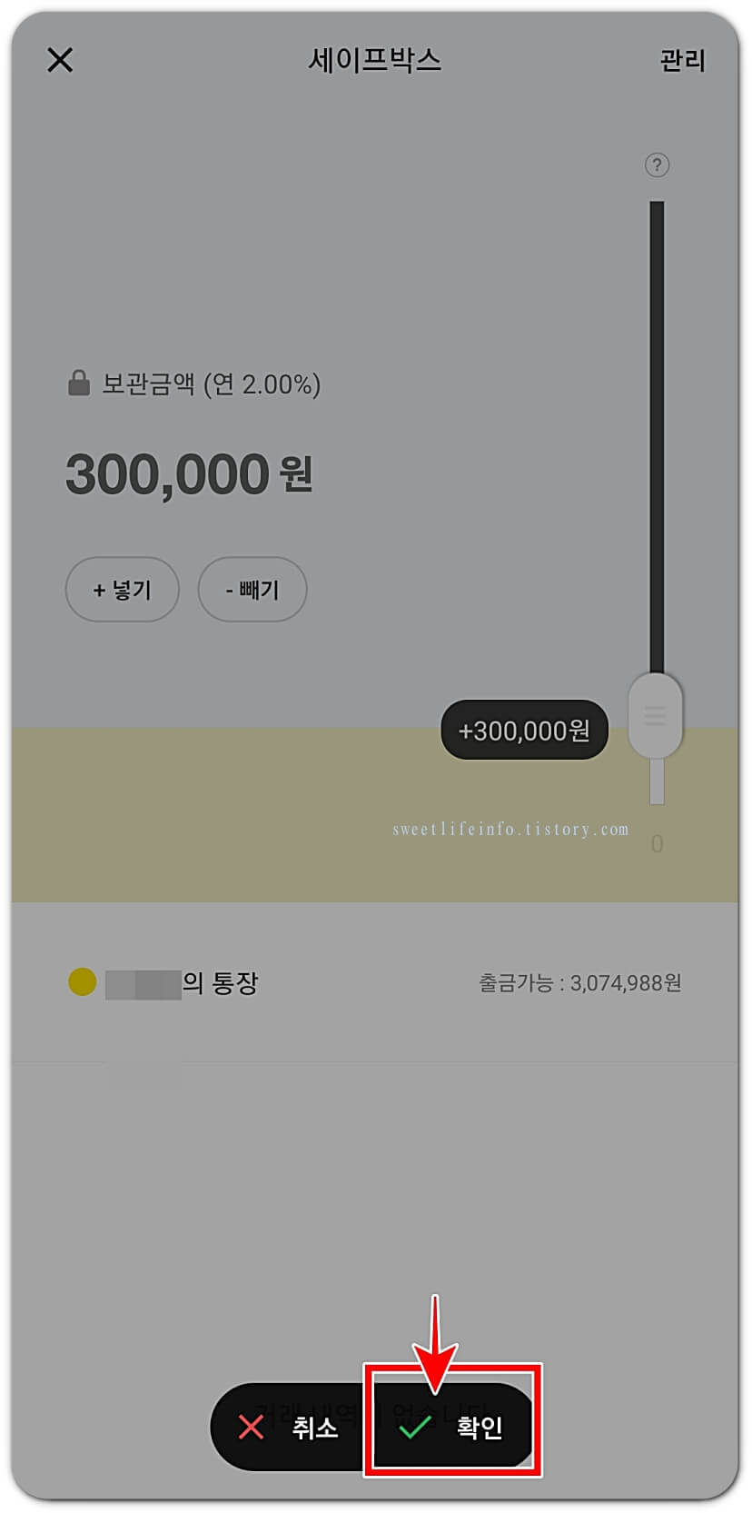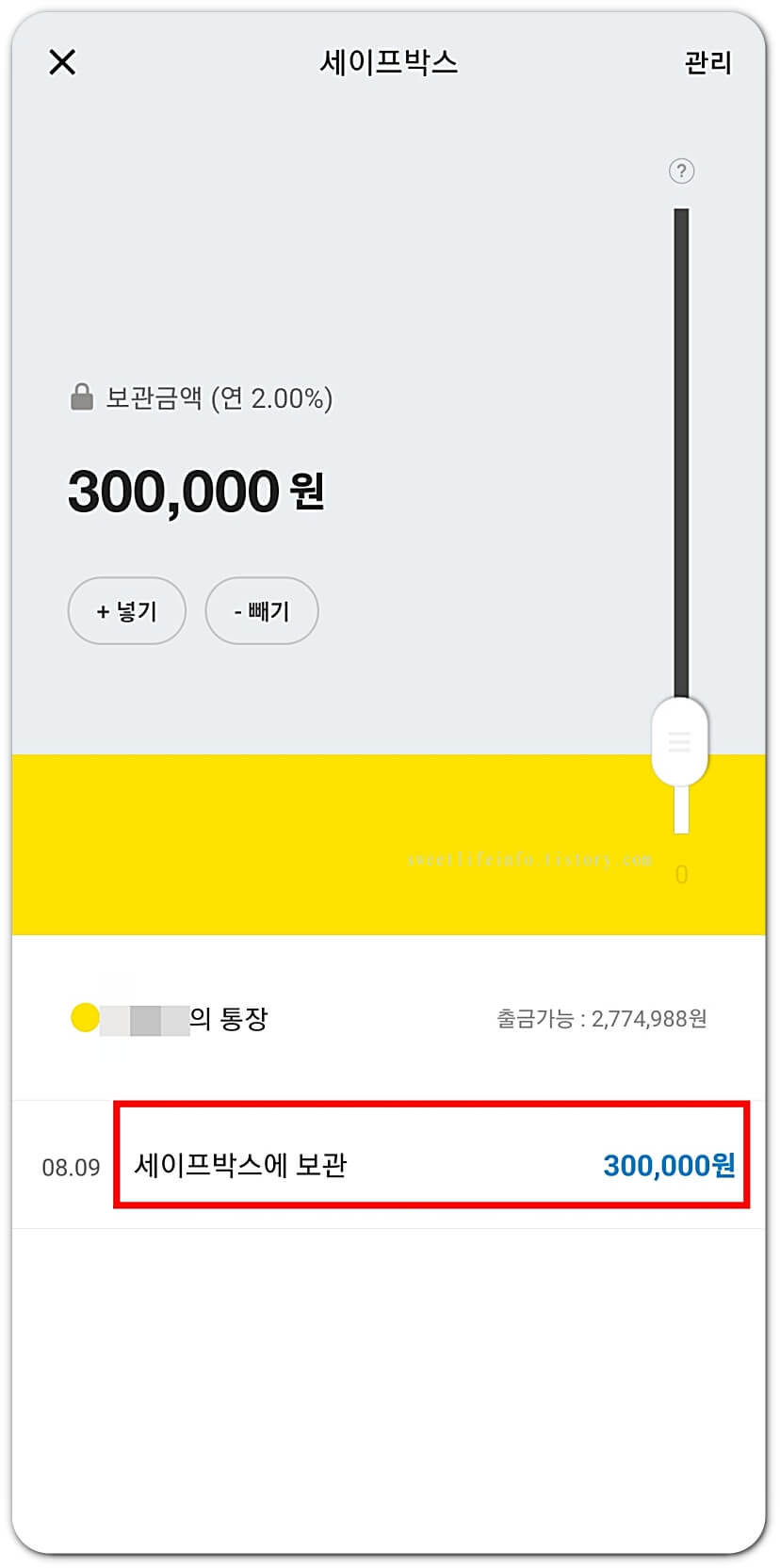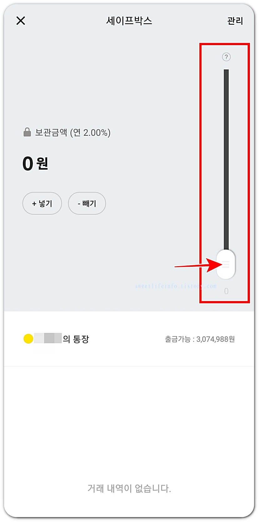 아래와 같은 화면이 뜨면 세이프박스 개설이 완료된 것인데요, 오른쪽의 슬라이드바를 조절해 세이프박스 금액을 설정하면 됩니다.