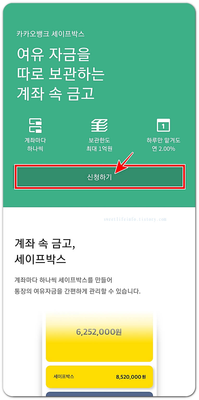 금리의 경우 지금 이 글을 작성중인 2022년 8월 기준으로 연 2.0%가 적용됩니다. 얼마 전까지만 해도 1%대였던 것 같은데, 기준금리가 상승하면서 카카오뱅크 세이프박스의 금리 역시 오른 듯 하네요.