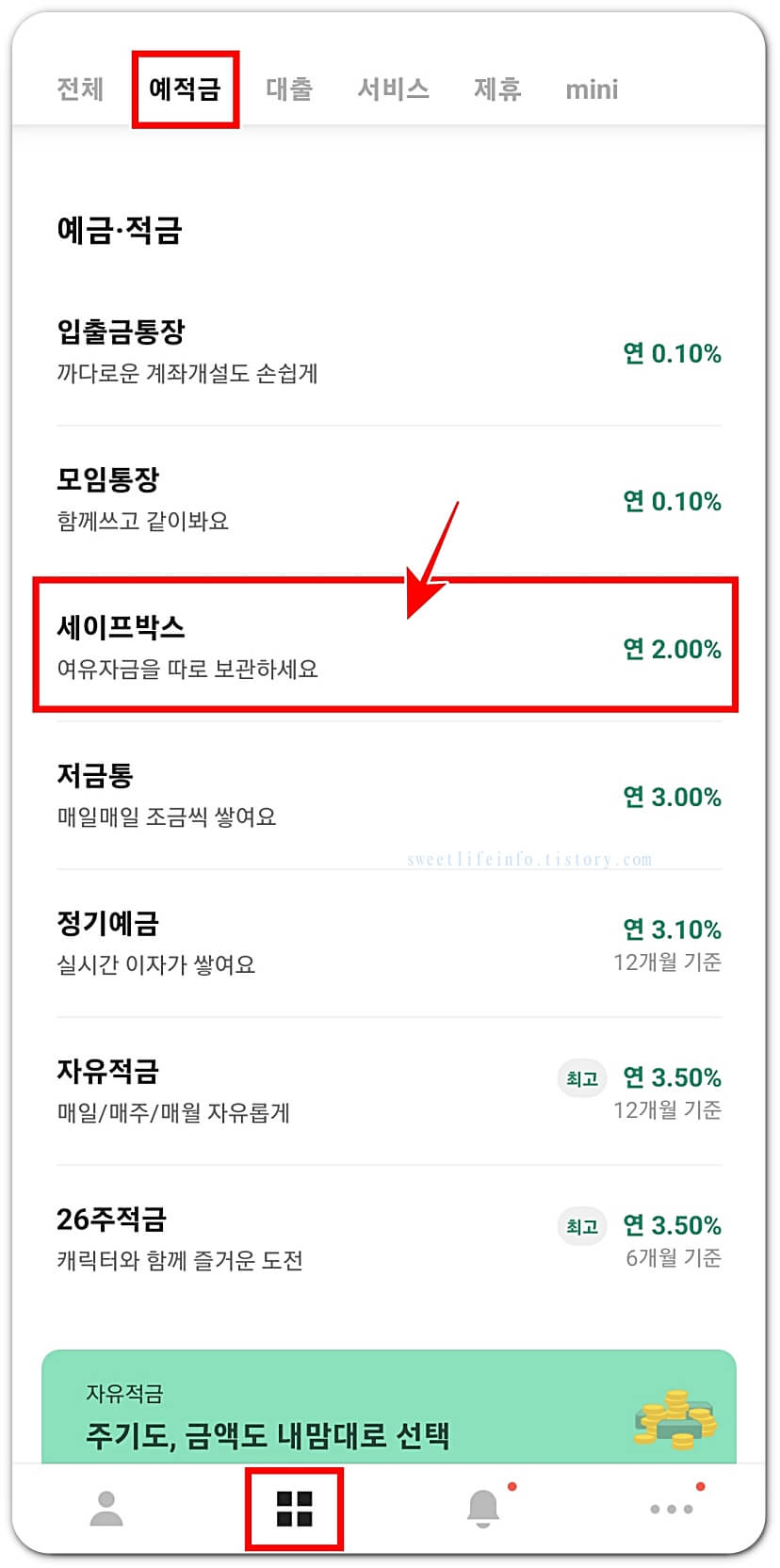 카카오뱅크 앱 접속 후 하단에 있는 메뉴 버튼을 누른 뒤, ‘예적금'탭에서 ‘세이프박스'를 선택합니다.