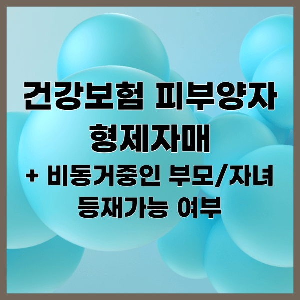 이번 글에서는 건강보험 피부양자 형제 자매 등재 요건에 대해 조금 더 상세하게 살펴보고, 비동거중인 부모와 자녀를 피부양자로 등재하고자 할 경우 필요한 요건에 대해 구체적으로 알아보려고 합니다.