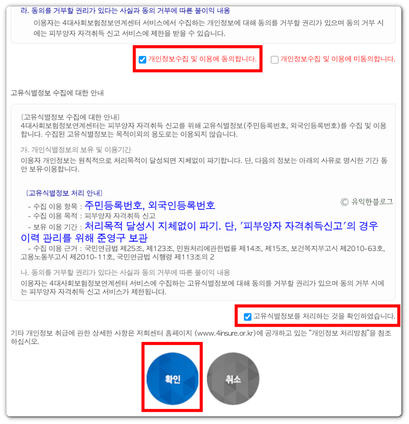 3. ‘개인정보수집 및 이용에 동의합니다.’, ‘고유식별정보를 처리하는 것을 확인하였습니다.’에 체크한 뒤, ‘확인’을 눌러주세요.