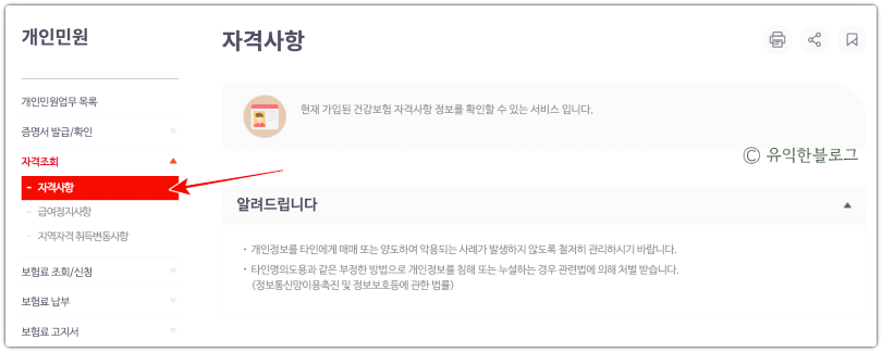 왼편에 뜨는 메뉴 중 ‘자격조회’ > ‘자격사항’에서 피부양자 등록 여부를 확인해보실 수 있습니다.