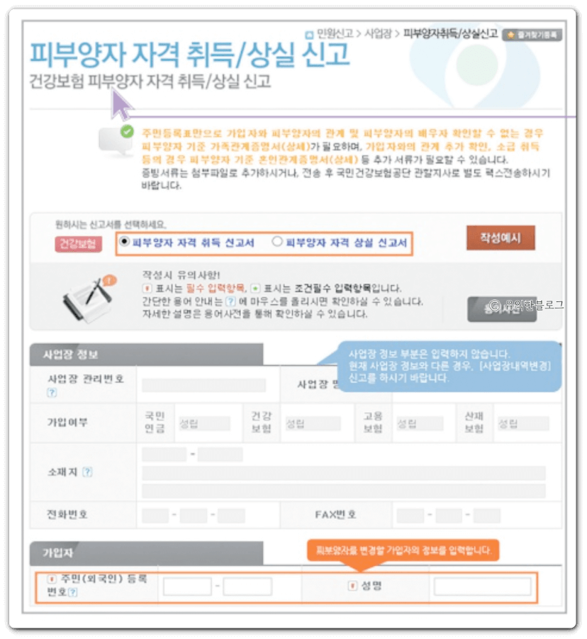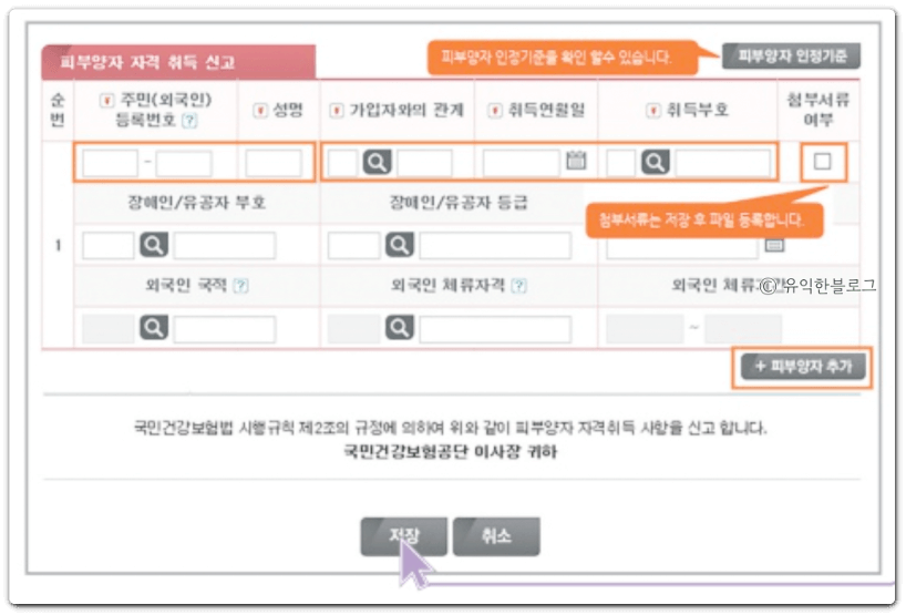 그리고 ‘피부양자 자격 취득 신고’란에 피부양자 주민번호, 가입자와의 관계, 취득연월일, 취득부호 등을 입력해주시면 됩니다.