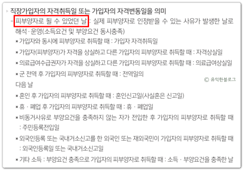 취득원열일의 경우 피부양자로 될 수 있었던 날로 소급해서 적어주시면 되는데요, 아래 내용을 참고해주세요.