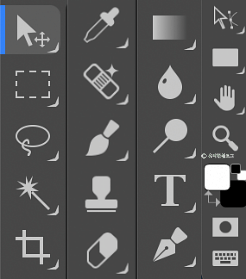 이동 도구, 선택 도구, 올가미, 자르기, 스포이드 등 포토샵에 있는 왠만한 기능을 다 갖추고 있는 것을 볼 수 있습니다.