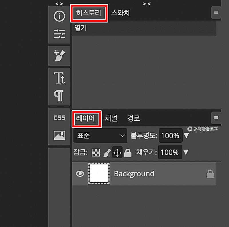 화면 오른편을 보면 ‘히스토리’, ‘레이어’ 등이라고 적혀있는 탭이 있는데요, 여기서 해당 기능을 사용할 수 있습니다.