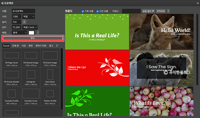 ‘새 프로젝트’를 누르면 아래와 같은 화면이 뜨는데요, 왼편에서 이미지 사이즈를 설정할 수 있습니다. 오른편에서는 템플릿을 선택할 수도 있어요.
