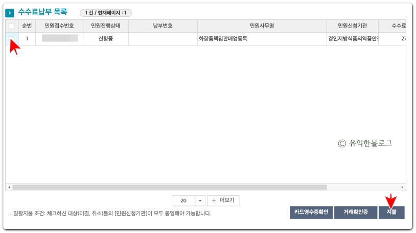 의약품 안전나라 홈페이지에서 '마이 페이지 > 나의 민원 > 수수료 납부' 메뉴로 들어가시면 납부를 해야 될 수수료가 뜨는 것을 볼 수 있습니다. 왼쪽 체크박스에 체크를 하시고, 하단 오른편에 있는 '지불' 버튼을 눌러서 수수료 납부를 하시면 됩니다.