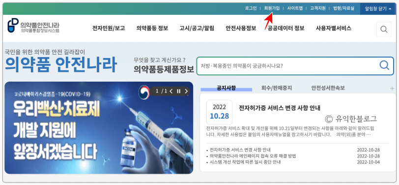 의약품안전나라 홈페이지에 접속한 뒤, 오른쪽 상단에 있는 회원 가입 버튼을 눌러서 회원 가입을 진행해 주세요.