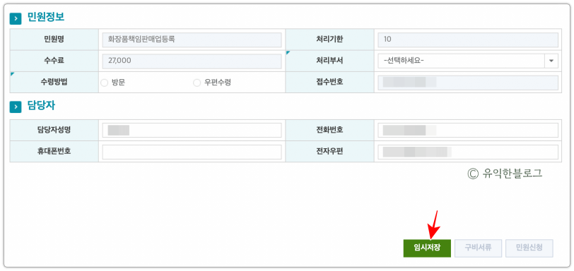 그리고 '처리부서'의 경우 저는 제 사업장 소재지가 있는 곳으로 선택을 했고, 수령 방법은 우편 수령으로 선택을 했습니다.
