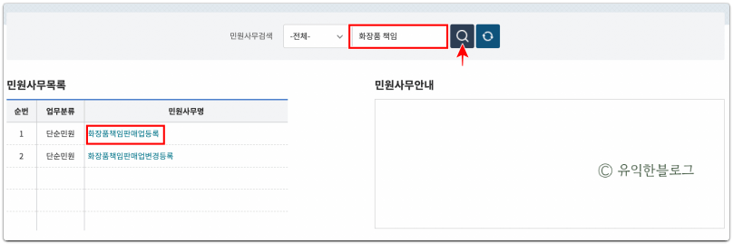 '민원사무검색'이라고 되어 있는 검색창에 '화장품 책임'이라고 입력하고, 돋보기 버튼을 눌러주세요.
