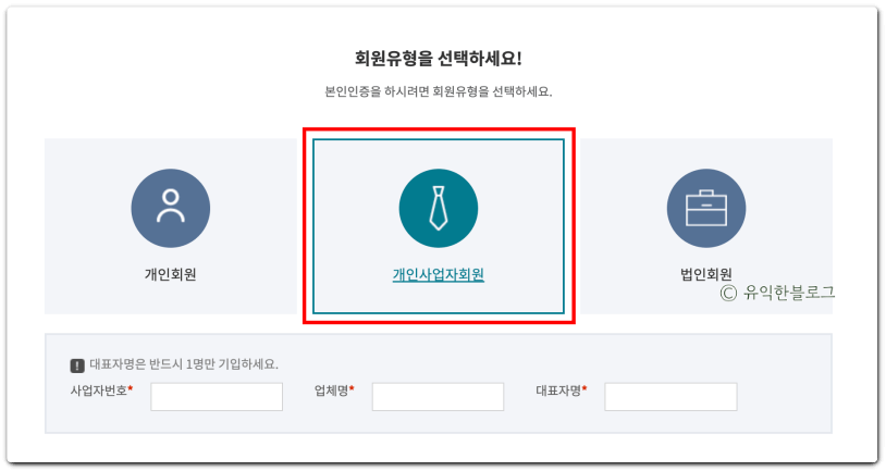 개인 사업자라면 중간에 있는 '개인 사업자 회원'을 선택을 하시고 가입을 진행을 해주시면 됩니다. 그리고 사업자번호, 업체명, 대표자명을 입력을 해줍니다.