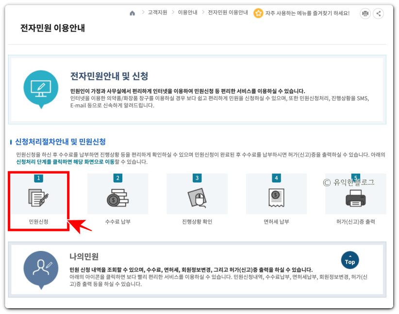 여기서 '민원신청'이라고 되어 있는 메뉴를 선택해 주세요.