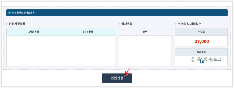 그러면 아래쪽에 이렇게 수수료 27,000원이라고 뜨는 것을 확인할 수 있습니다. 그 아래에 있는 '민원신청' 버튼을 눌러주세요.