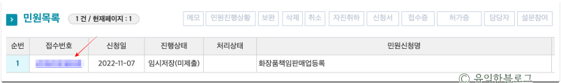 임시 저장을 누른 다음, 민원 목록으로 이동을 하시면 방금 작성한 민원 목록이 뜨게 되는데요. 방금 작성한 민원에 해당하는 접수번호를 클릭합니다.