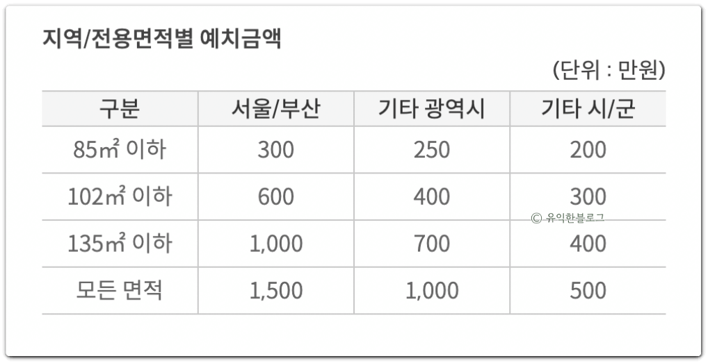 지역/전용면적별 예치금액 기준은 아래 표를 참조해 주세요. 신혼특공은 전용면적 85m² 이하의 주택이 대상이 되므로 서울&부산 300만원, 기타 광역시 250만원, 기타 시군 200만원을 예치하면 되겠습니다.