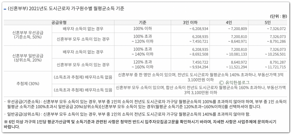 세대의 월평균 소득이 전년도 도시근로자 가구당 월평균 소득의 100퍼센트(신혼부부 모두 소득이 있는 경우에는 120퍼센트) 이하이면 ‘우선공급’을 선택할 수 있으며,