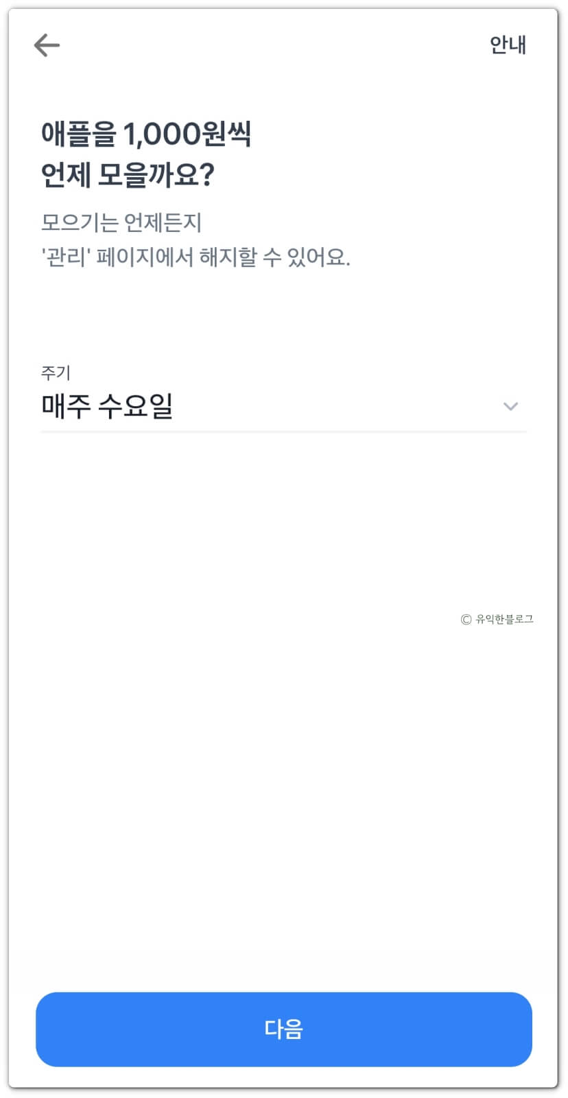 다음으로는 모으는 주기를 선택해야 하는데요, 매일, 매주, 매달 중 선택이 가능합니다.