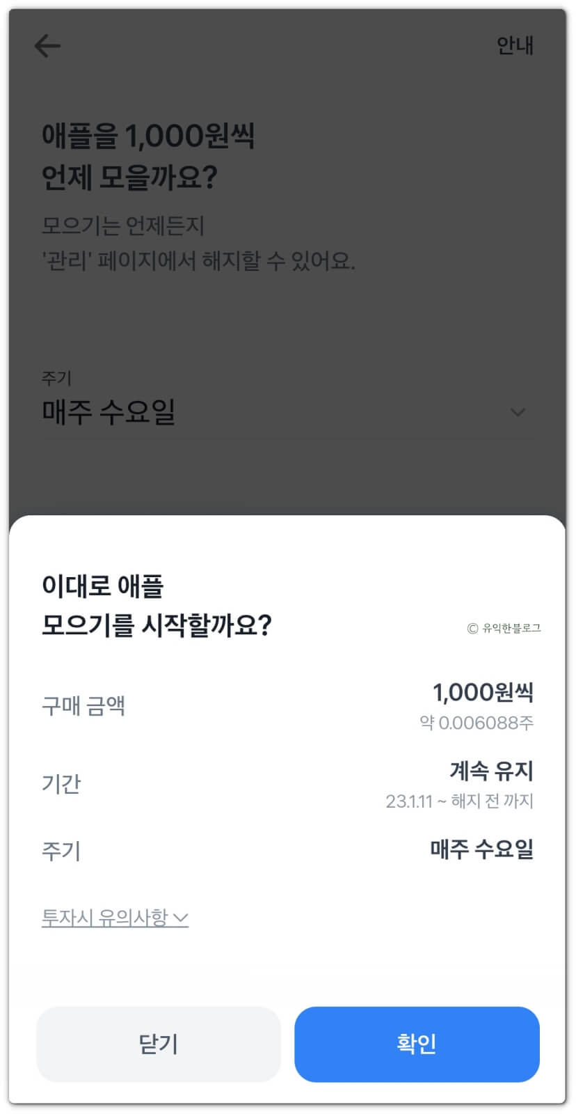 그러면 마지막으로 확인하는 화면이 뜹니다. 금액과 기간, 주기를 다시한번 확인하고, ‘확인’을 눌러주면 됩니다.