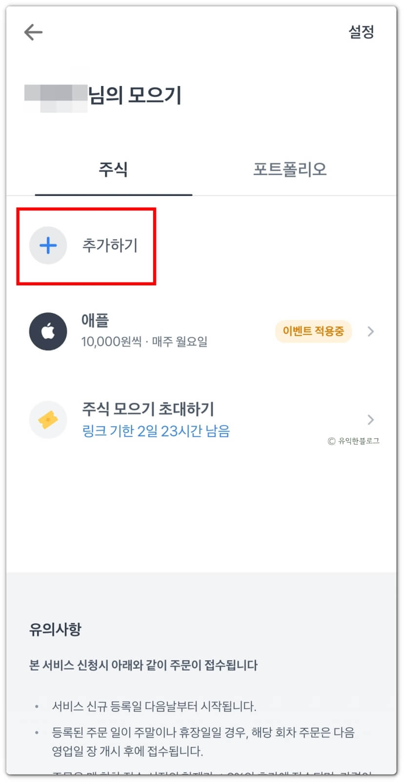 여기서 ‘추가하기’를 누른 뒤, 모으고자 하는 주식을 선택해 주세요.