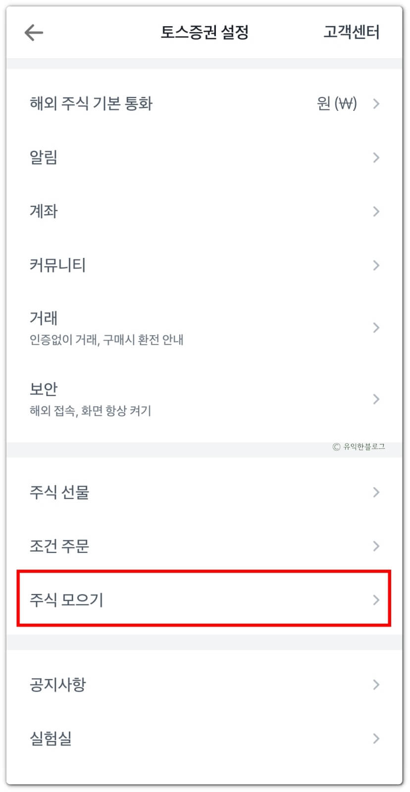 그리고 오른쪽 상단 톱니바퀴를 누르면 설정 메뉴가 뜨는데요, 스크롤을 아래로 내리면 ‘주식 모으기’라는 메뉴가 있습니다. 이걸 선택해주세요.
