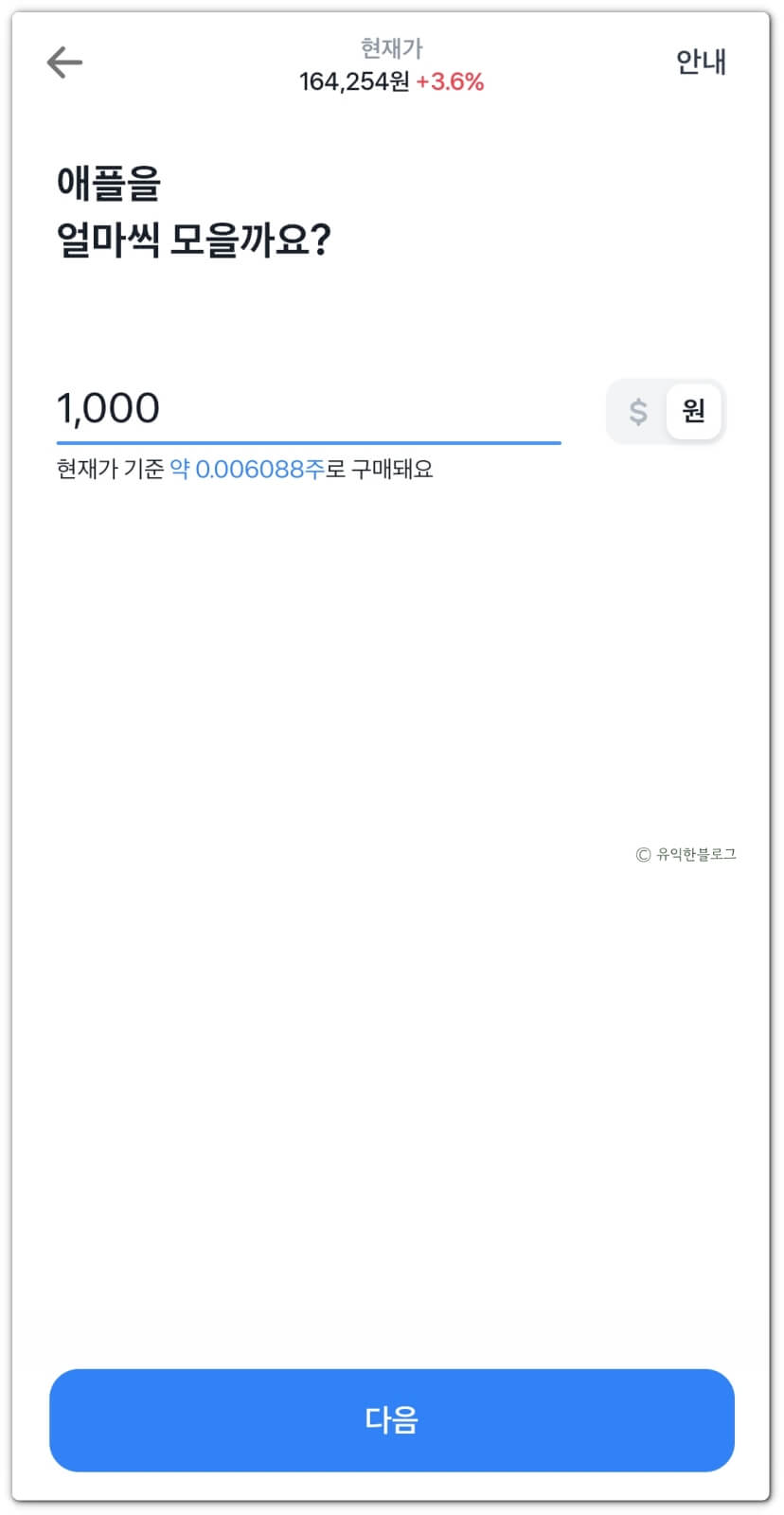 선택한 주식을 얼마씩 모을지 입력하고 ‘다음’을 터치해주세요.