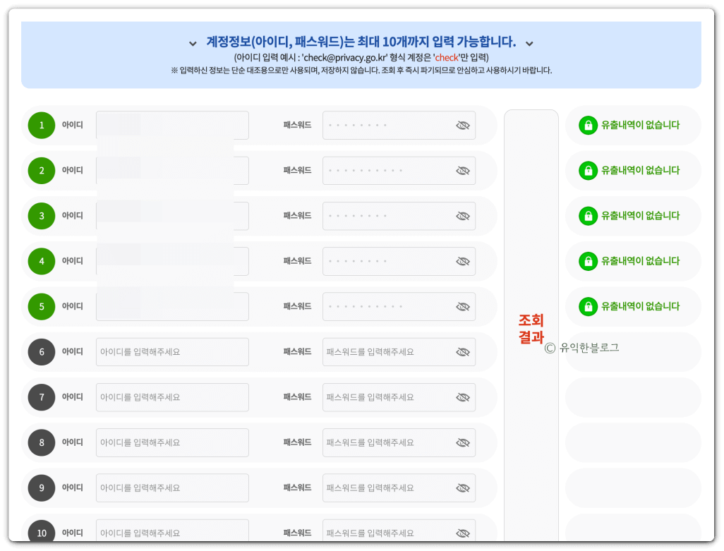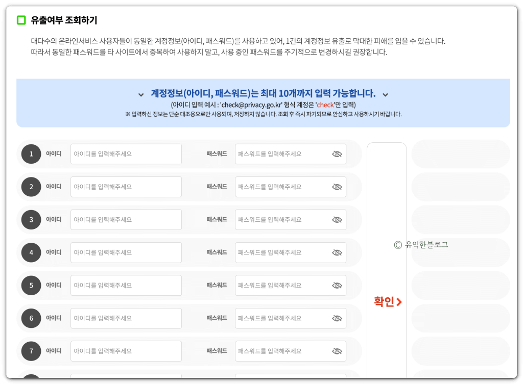 그러면 이렇게 유출여부를 조회할 수 있는 화면이 뜨는데요, 아이디와 패스워드 조합으로 총 10개까지 입력할 수 있습니다.