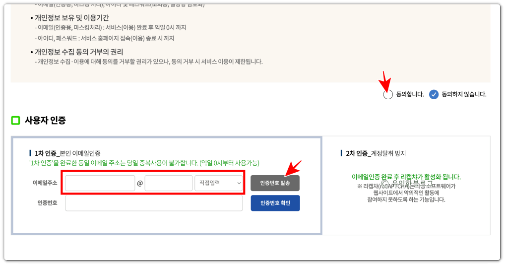 ‘개인정보 수집·이용 동의’ 하단의 ‘동의합니다’에 체크를 해 주세요.