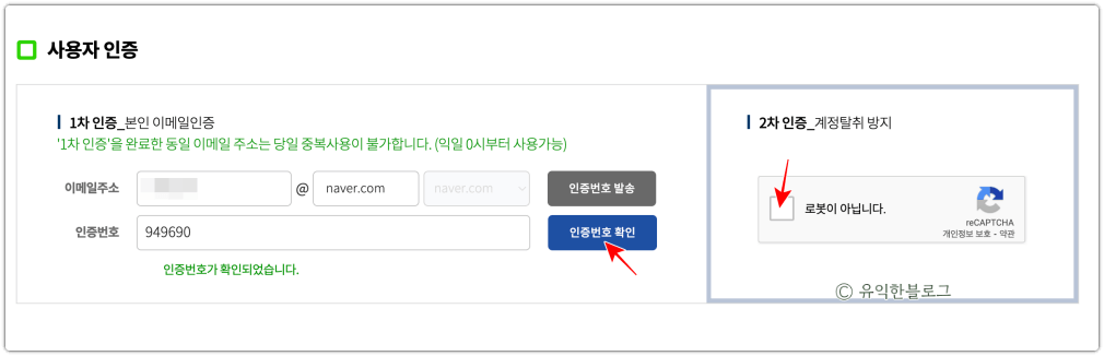 인증번호가 확인되면 오른편에 ‘로봇이 아닙니다.’ 라는 화면이 표시되는데요, 하얀 박스에 체크를 해 주면 됩니다.