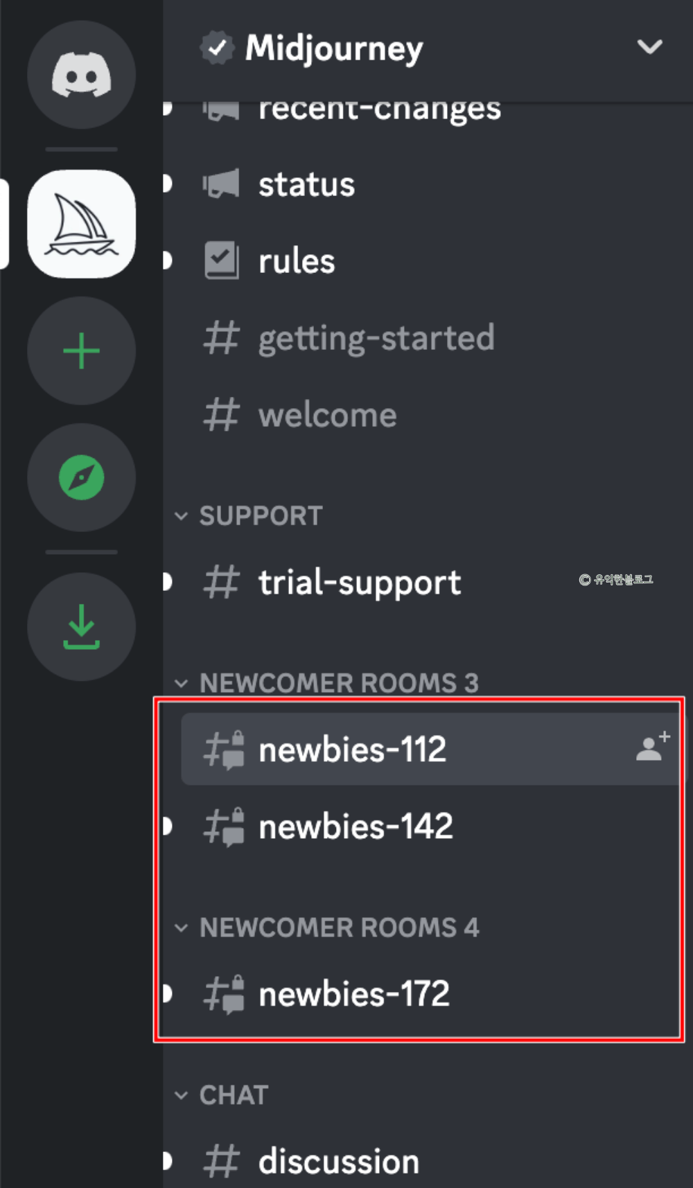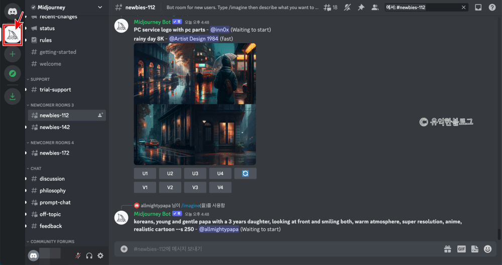 가입을 마치면 아래와 같은 화면이 보입니다. 만약 보이지 않는다면 디스코드 사이트에 접속 후 로그인을 한 다음, 왼편의 요트 모양 아이콘을 눌러 미드저니 서버로 접속하면 됩니다.