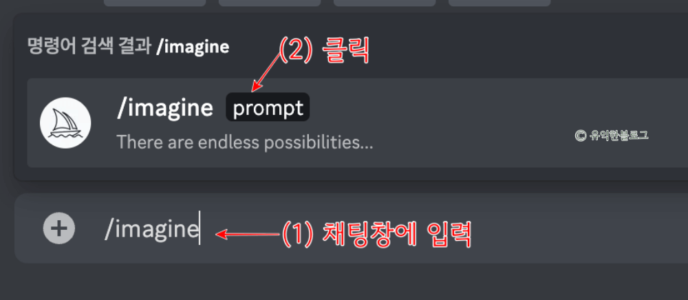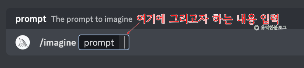 그리고 하단의 채팅창에 ‘/imagine’ 이라고 입력합니다. 그러면 창 위에 명령어가 검색되는데, 이걸 클릭한 다음 prompt 라고 되어 있는 곳에 그리고자 하는 이미지의 내용을 입력하고 엔터를 치면 됩니다.