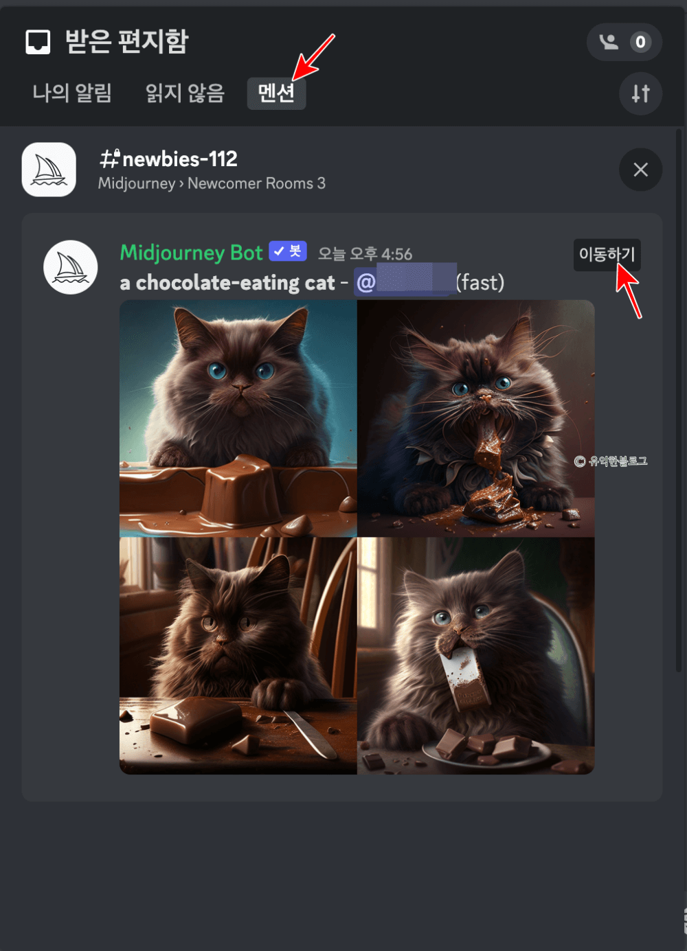 조금 기다리면 미드저니 봇이 내가 주문한 그림을 그리기 시작하게 됩니다. 그런데 채팅방 형식이다보니 다른 사람들이 생성한 이미지에 밀려 내가 쓴 내용을 찾기 힘든 경우가 발생합니다.