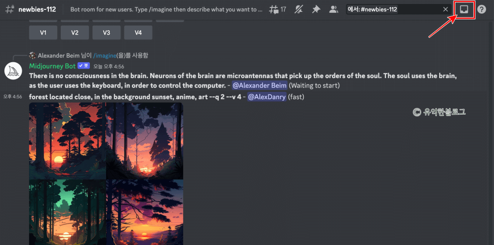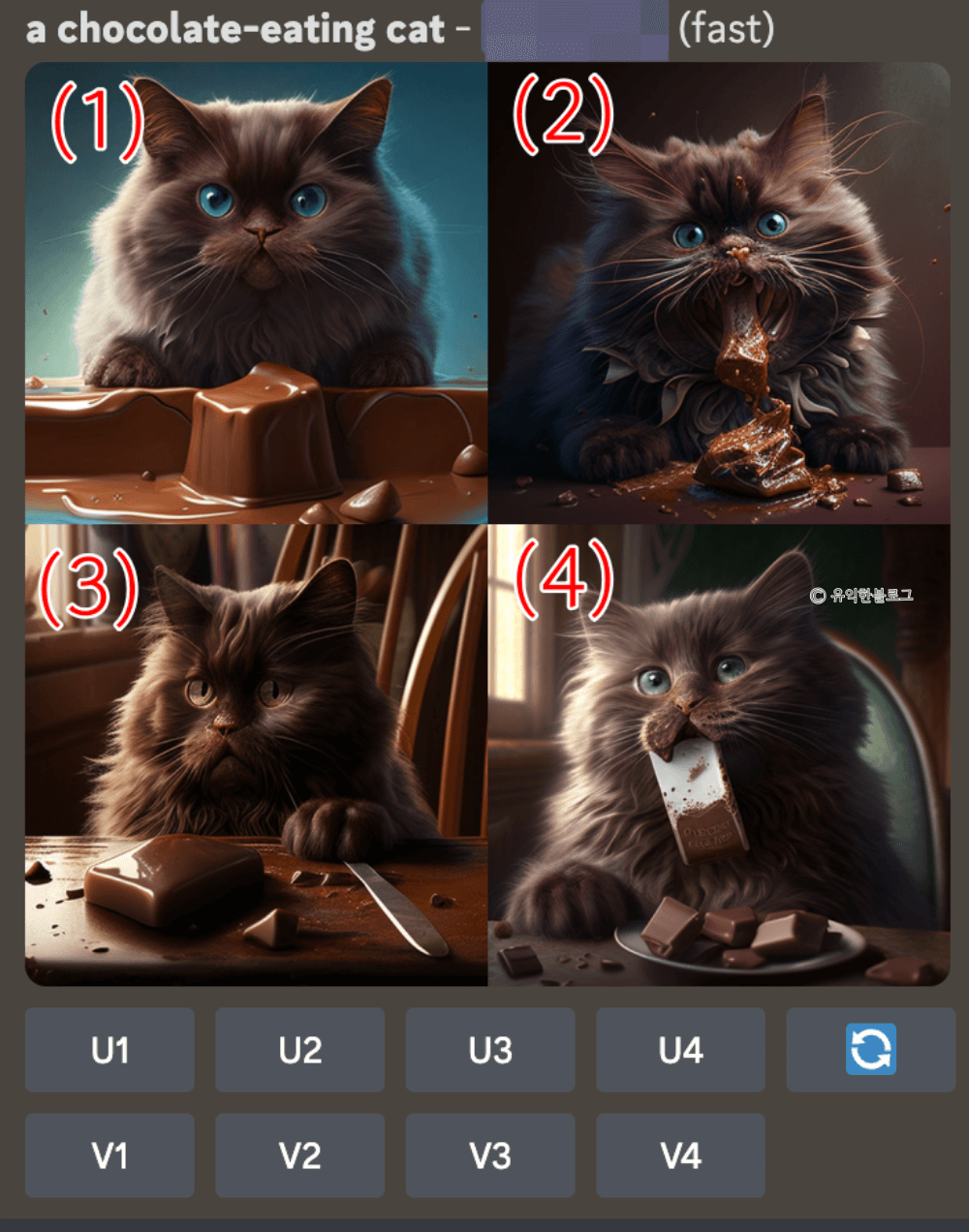 U1~4를 누르면 업스케일 이미지를 생성하고, V1~4를 누르면 비슷한 그림을 생성하게 됩니다.