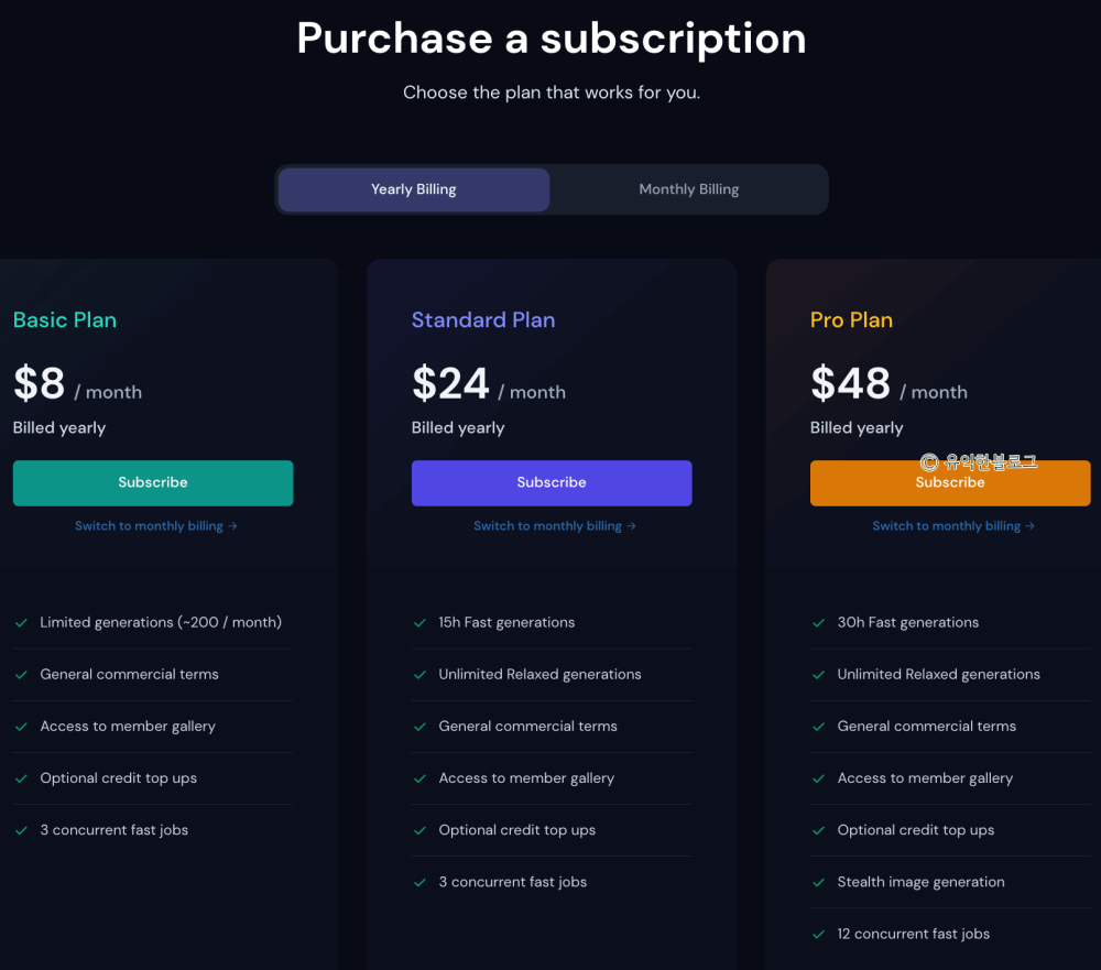 요금제는 베이직, 스탠다드, 프로 세 종류로 나뉩니다. 베이직은 월 200개까지 이미지 생성이 가능하고, 스탠다드 이상부터는 무제한으로 그림을 만들어낼 수 있습니다.