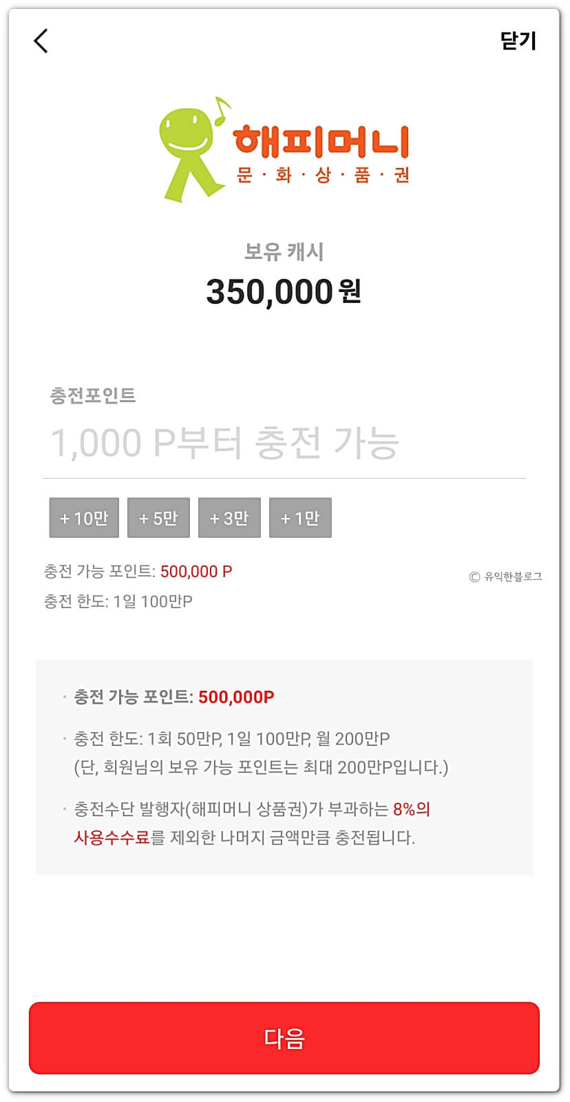 성공적으로 로그인을 마치면 내가 보유한 해피캐시가 뜨게 되는데요, 충전할 포인트를 입력한 뒤 ‘다음’을 눌러주시면 됩니다.