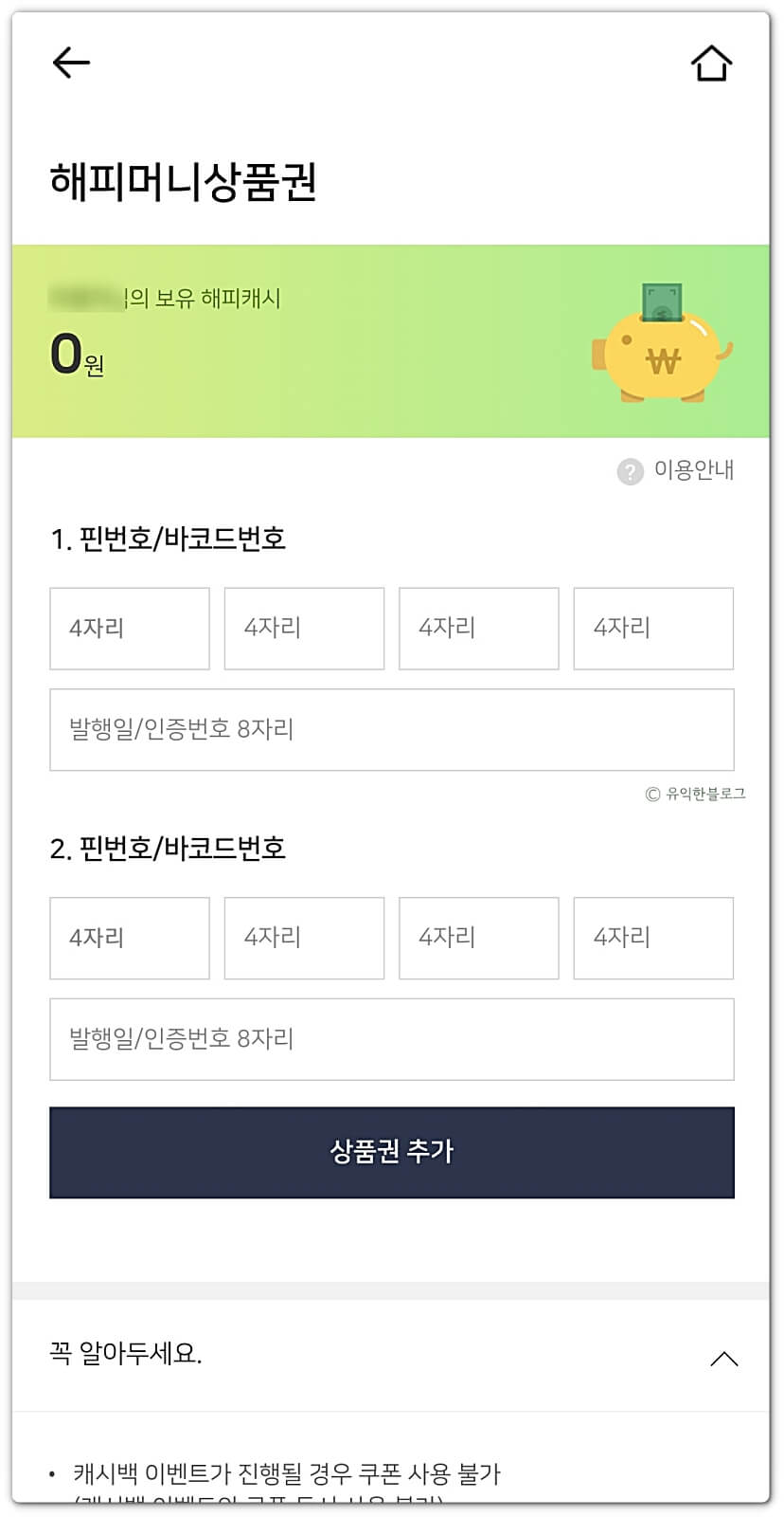 ‘상품권 추가’를 눌러 한번에 5개의 해피머니 상품권을 입력하실 수 있어요.