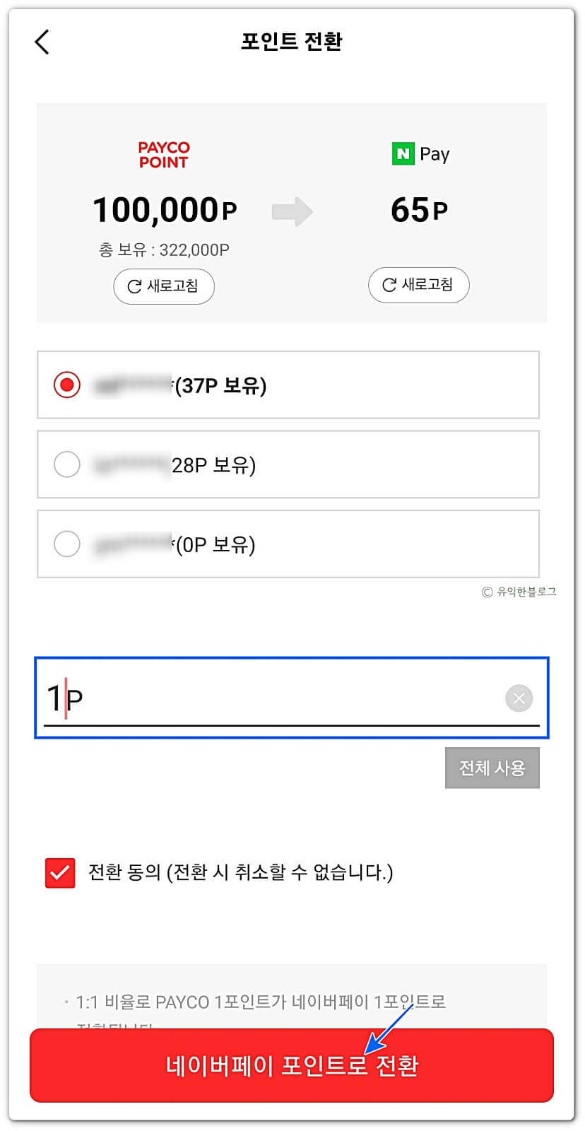 ‘전환 동의’에 체크하고, ‘네이버페이 포인트로 전환’을 눌러주시면 됩니다.