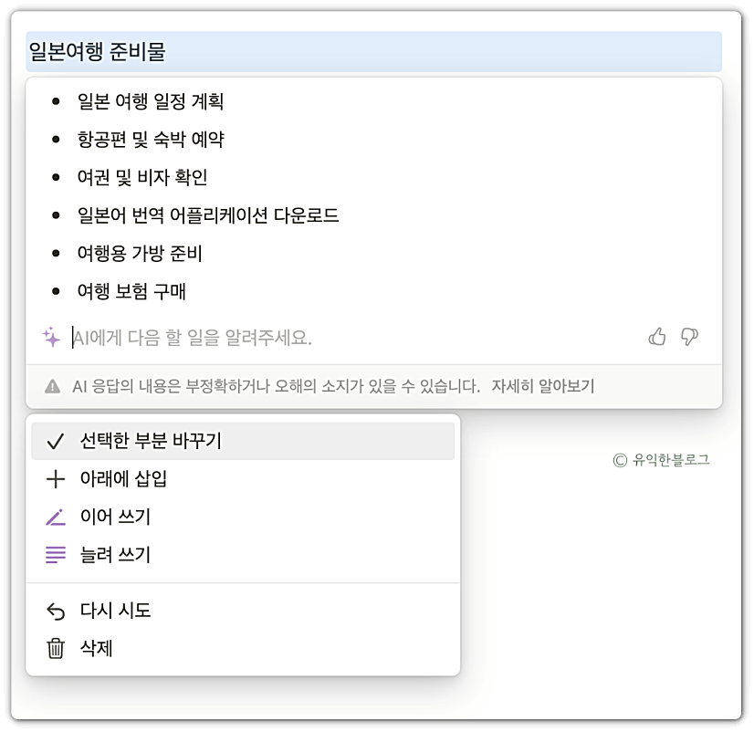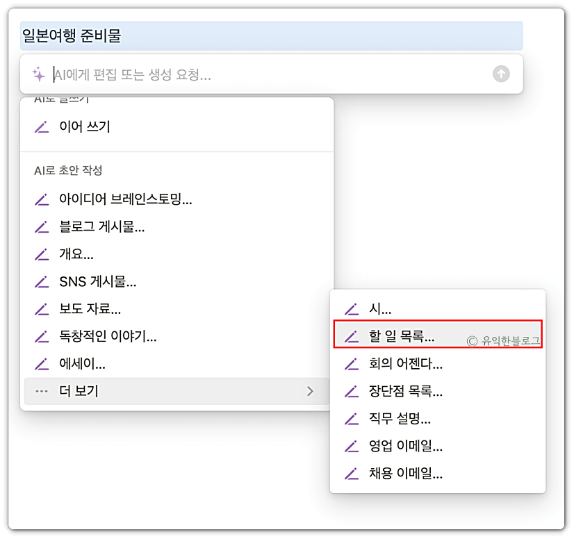 시험삼아 ‘일본여행 준비물’ 이라고 입력해 놓고, ‘AI로 초안 작성’ 섹션에 있는 ‘할 일 목록’을 눌러보았습니다.
