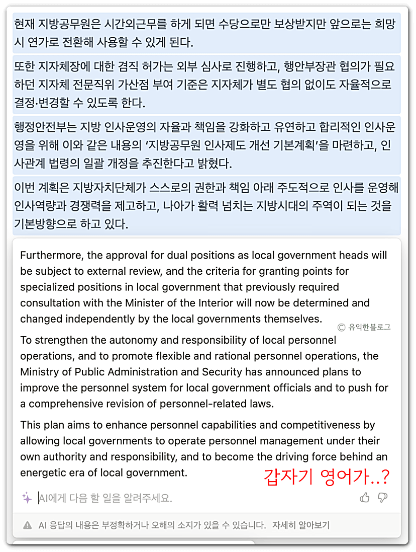 아래 화면은 노션 AI에게 ‘심플한 말로 바꾸기’를 요청한 모습입니다. 엉뚱하게도 영어로 글을 바꿔놓고 있는 모습이네요. 가끔씩 이렇게 오락가락(?) 하는 것 같습니다.