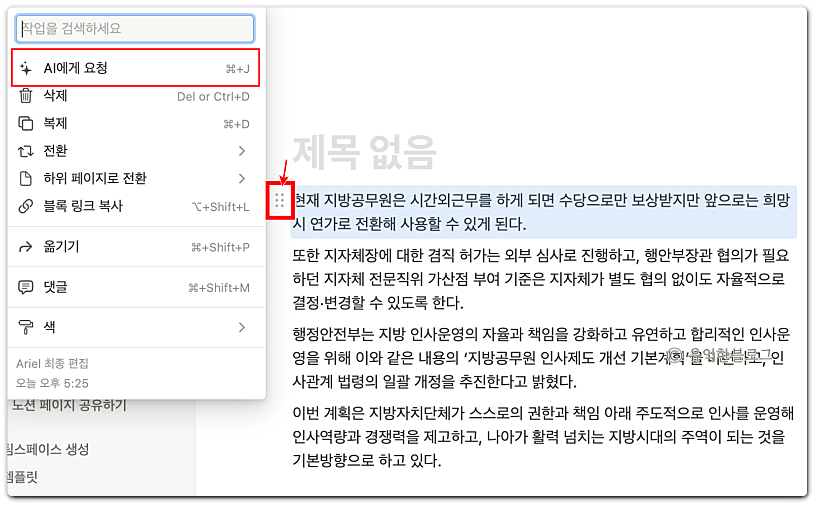 노션에서 내용을 입력한 뒤, 해당 블럭 왼쪽의 점 6개 버튼을 클릭하면 관련 메뉴가 뜨게 되는데요, 여기 보면 ‘AI에게 요청’이라는 메뉴가 있는 것을 볼 수 있습니다.