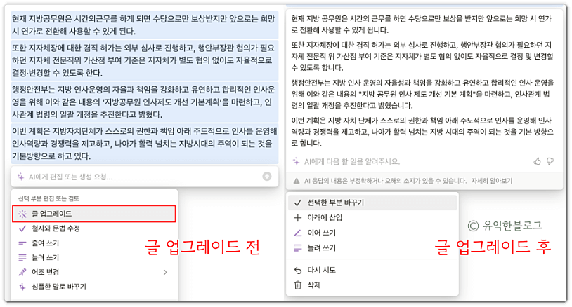 아래 화면은 노션 AI의 ‘글 업그레이드’ 기능을 이용해 본 모습인데요, 왼쪽 글이 업그레이드 전, 오른쪽 글이 노션 AI로 글 업그레이드를 한 후입니다.