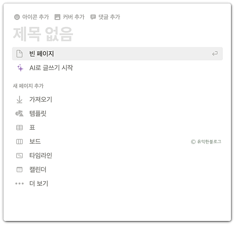 노션 AI 사용법은 크게 어렵지 않습니다. 예를 들기 위해 먼저 새 페이지를 하나 생성해보도록 할게요. 새 페이지를 만들면 아래와 같은 화면을 볼 수 있습니다.