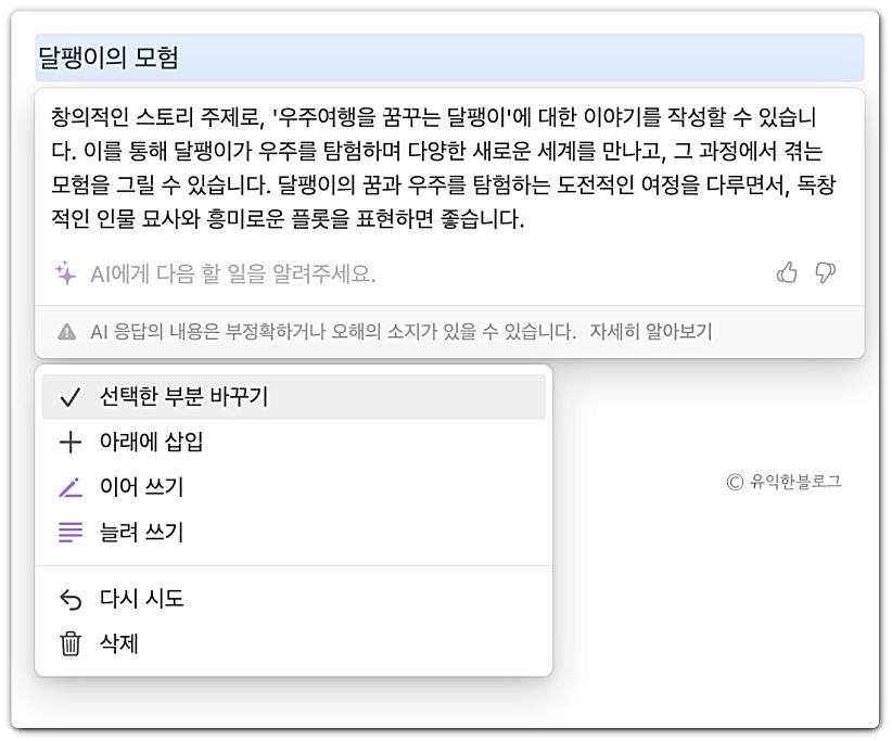 AI 글쓰기 기능도 다양합니다. 아래와 같은 기능들이 있어요.