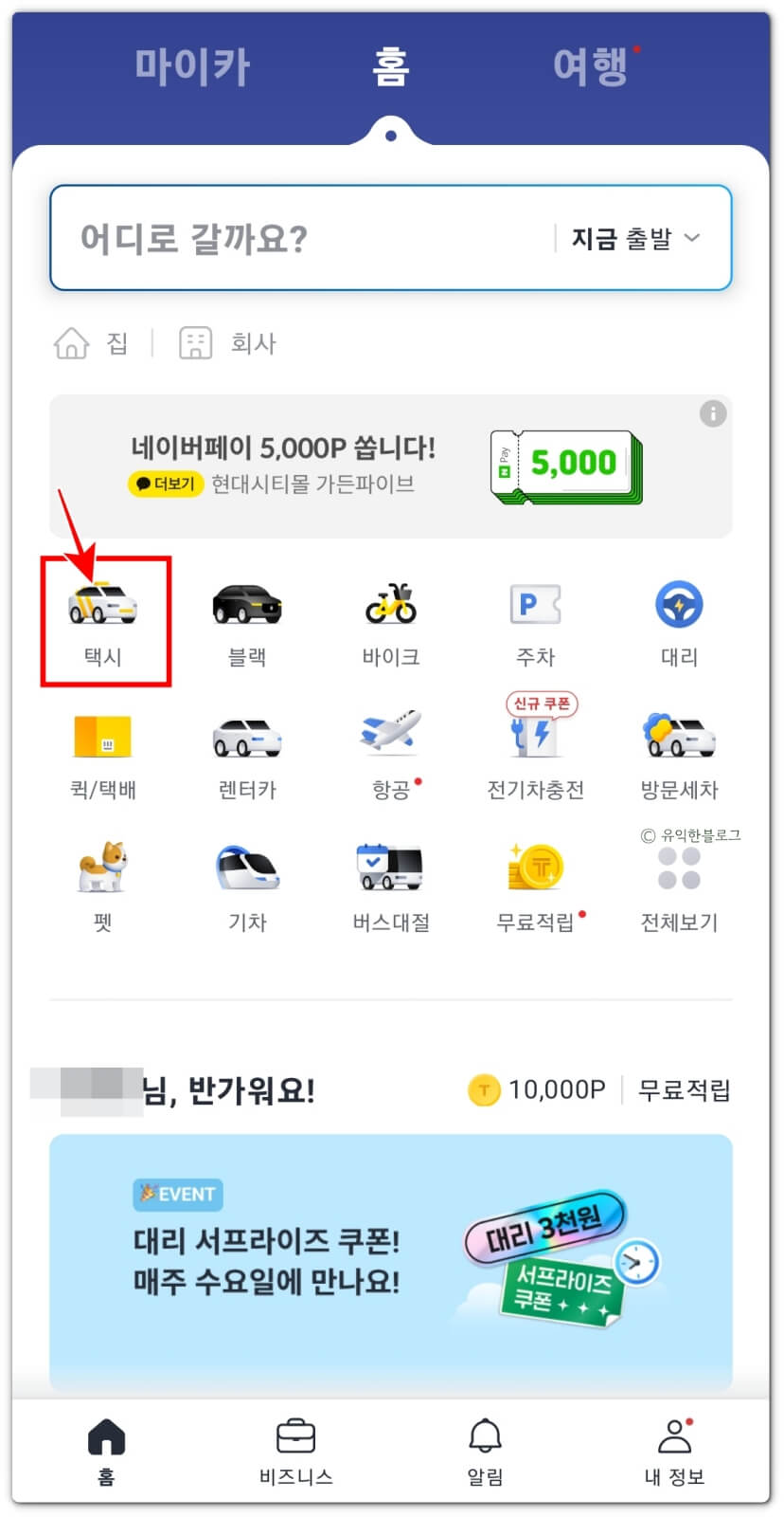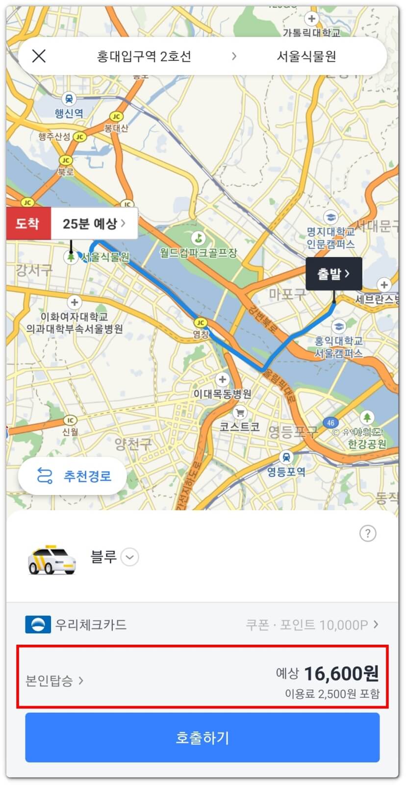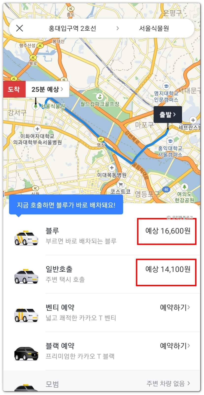 참고로 여러 종류의 택시가 뜨는데, ‘일반호출’이라고 되어 있는 부분을 기준으로 보시면 될 것 같아요. ‘블루’는 전문교육을 이수한 기사님이 운행하는 차량으로, 0~5,000원의 이용료가 추가로 붙습니다.