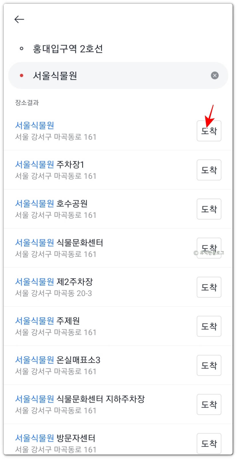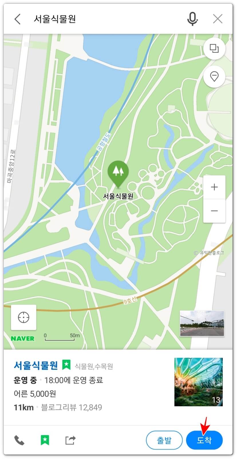 그러면 아래와 같이 해당 장소에 대한 정보와 함께 하단에 ‘출발’, ‘도착’ 버튼이 뜨게 됩니다. ‘도착’ 버튼을 터치해주세요.