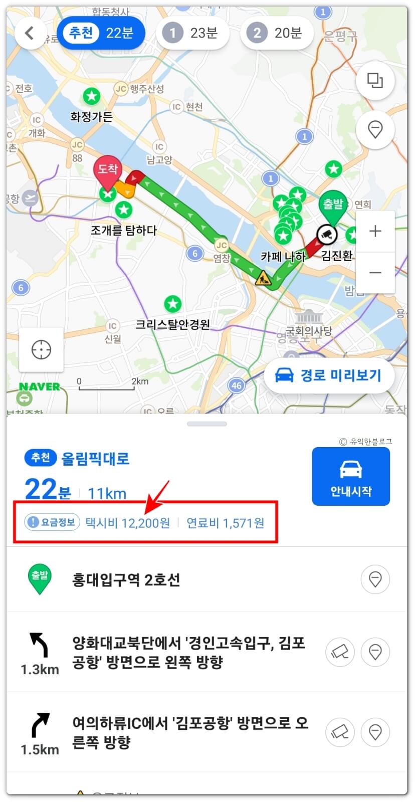 그러면 아래와 같이 예상 시간과 거리, 그리고 택시비 및 연료비가 표시되는 것을 볼 수 있어요. 실제 택시요금과 100% 일치한다고는 보기 어렵지만 어느정도 비슷하다고 보시면 될 것 같아요.