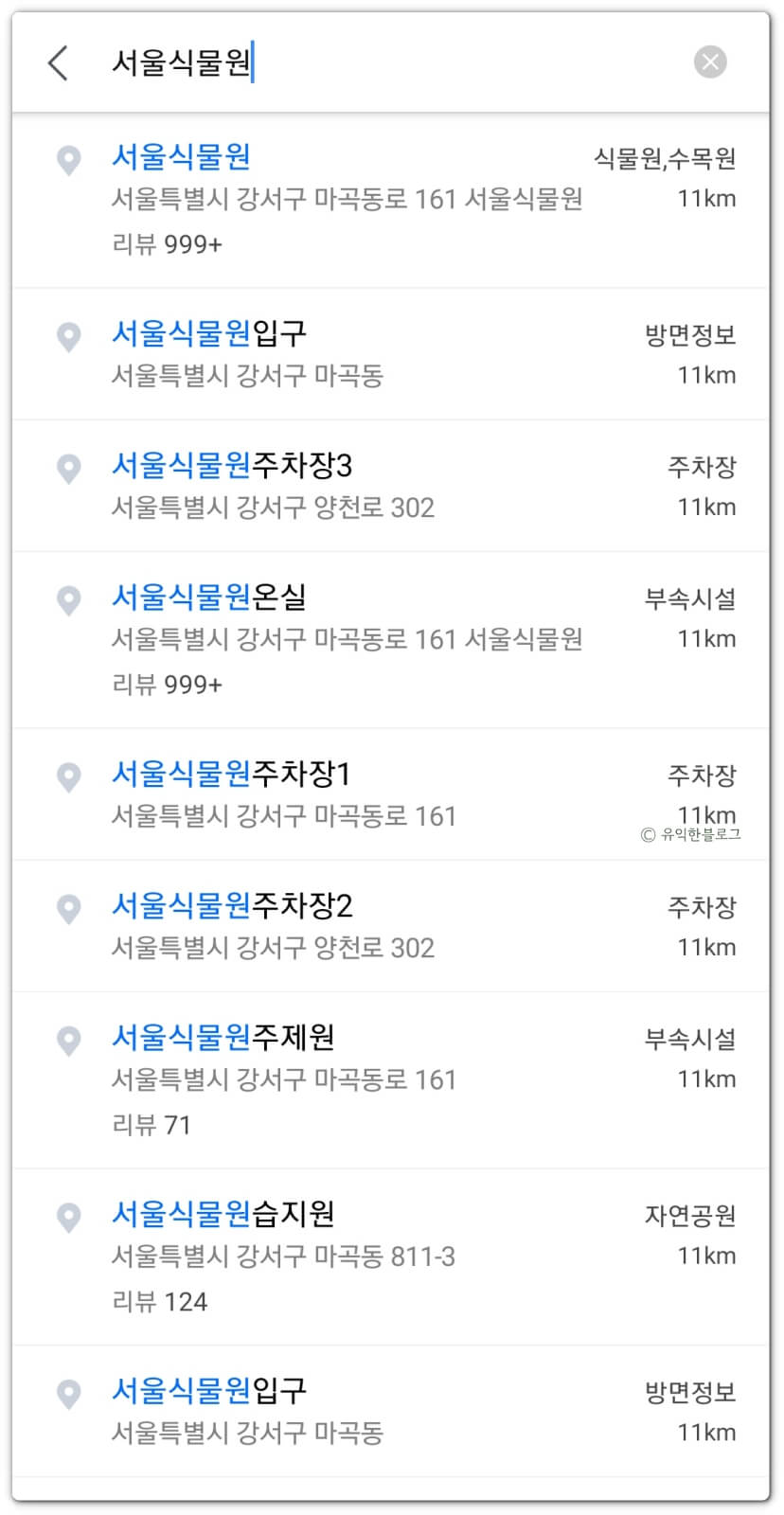 상단의 검색창을 이용해 내가 가고자 하는 곳을 검색해 주세요. 장소 이름이나 지하철역으로 검색해도 되고, 상세한 주소를 알고 있다면 주소로 검색해도 됩니다. 저는 ‘서울식물원’을 검색해 보았습니다. 검색창에 입력하자마자 아래에 검색 결과가 뜨는 것을 볼 수 있어요.
